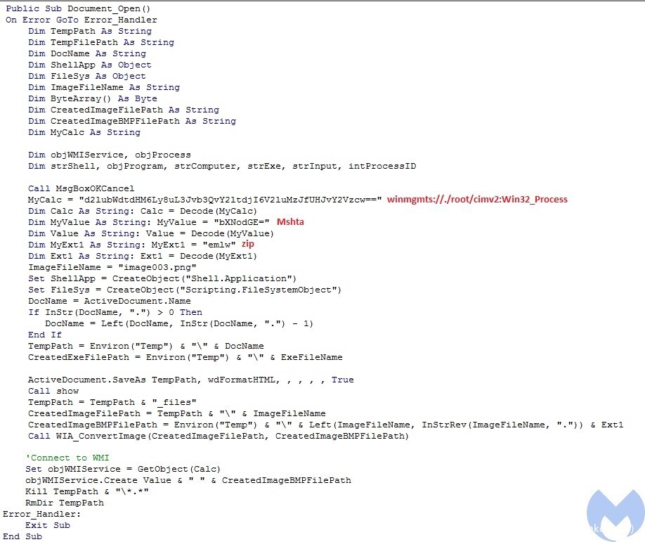 以base64格式定义所需的变量,如WMI对象、Mshta与文件扩展名,然后调用Decode函数对其进行base64解码。