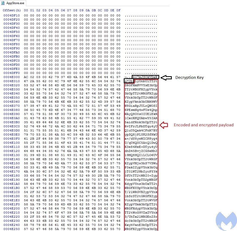 AppStore.exe将加载一个base64编码的payload,该payload将被添加到该程序的末尾。在有效载荷之前,有一个字符串,它其实就是相应的解密密钥(by7mJSoKVDaWg*Ub)。
