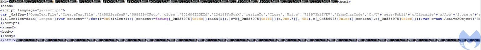 实际上,宏代码会在图像转换过程中将扩展程序名zip添加到BMP文件中,以便将其伪装成zip文件。该BMP文件含有一个嵌入式的HTA文件。而该HTA文件又包含一个JavaScript脚本,该JavaScript脚本会在“C:\Users\Public\Libraries\AppStore.exe”目录中创建文件“AppStore.exe”,并向该文件填充相应的内容。