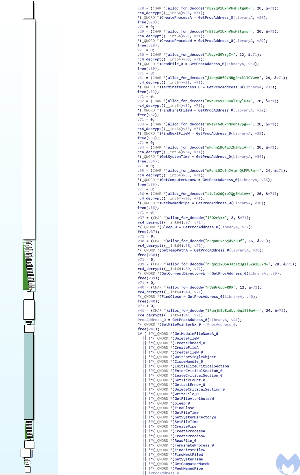 - 解析API调用:由于所有重要的API调用都经过了base64编码和RC4加密,因此,需要在运行时进行相应的解码和解密处理。其中,RC4解密的密钥是 “MicrosoftCorporationValidation@#$%^&*()!US”。