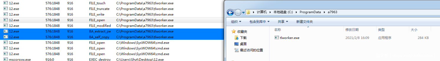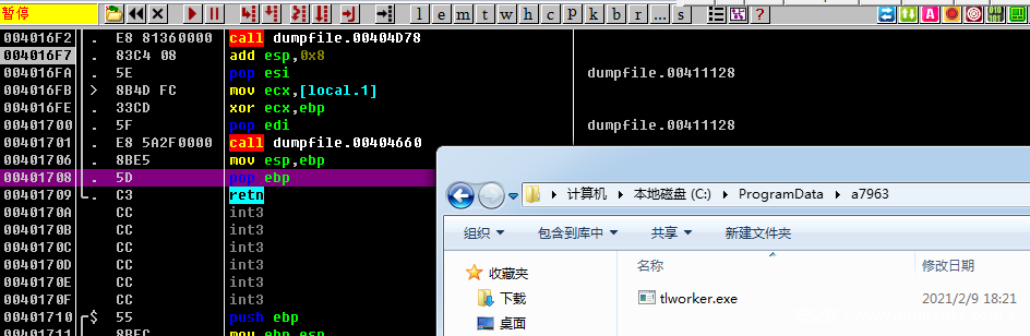 创建文件,然后在004016f2函数将自身写入到C:\ProgramData\a7963\tlworker.exe文件中