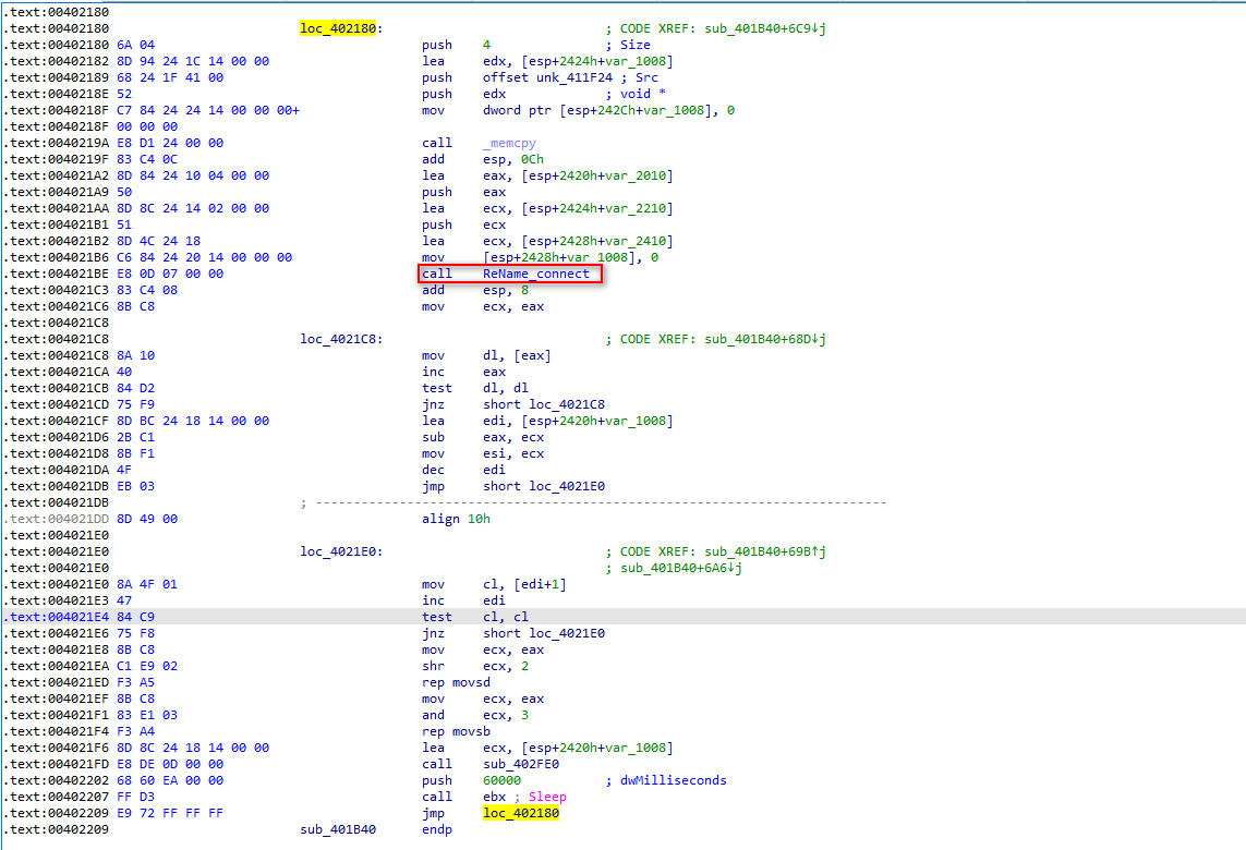 数据发送之后,程序会根据服务器返回执行对应的操作,并且休眠1分钟重复进行请求,也就是最开始在行为分析中看到的循环请求。由于末尾的跳转是jmp,并且中间并没有跳转可以跳出循环,说明这里是永真循环,程序执行到这里,功能已经执行完毕,后续则需要服务器返回执行。