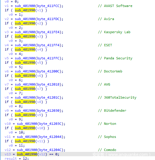 程序会调用这个解密函数解密出一系列杀软文件名并判断是否存在这些杀软文件名