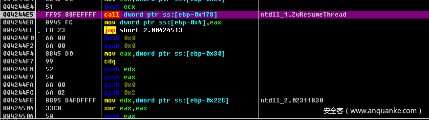 接着程序通过ZwResumeThread、ZwSetContexThread这一套进行傀儡进程注入