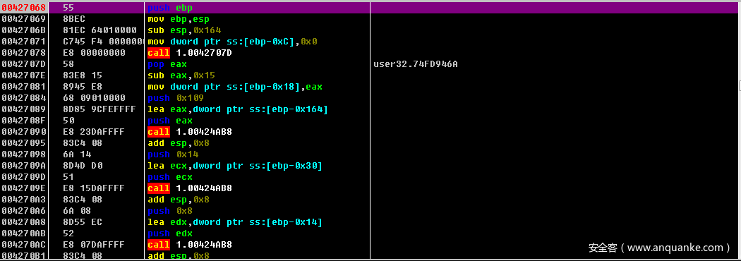 直接在00427068处设置断点过来