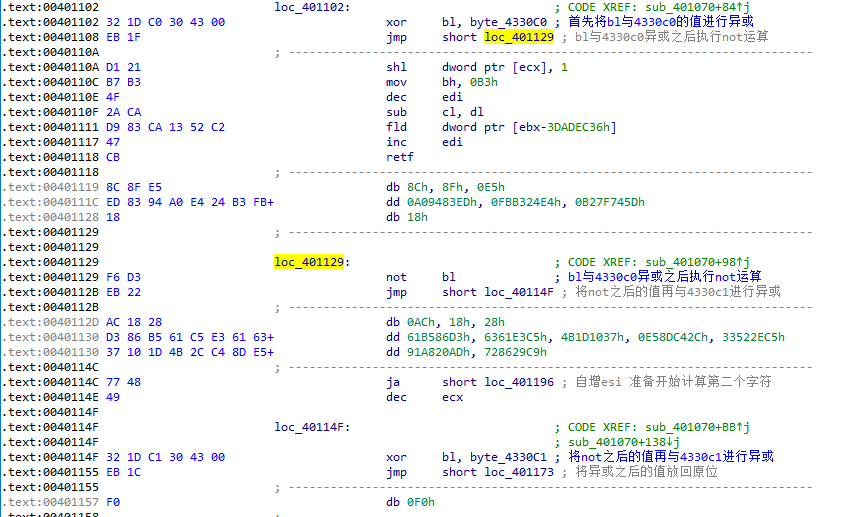 异或之后,程序会将bl的值进行not运算,运算之后的值依旧在bl寄存器中,此时,程序再将bl与4330c1的值进行异或,异或的值放入bl寄存器。