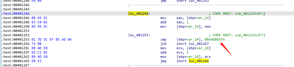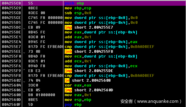 此样本由MFC编写,样本运行后会通过一个超大循环以延迟关键代码执行,起到一定的反检测作用,这里是个for循环,循环变量每次自增1,循环条件是变量小于0x0BAADBEEF,循环体是给ebp+var_18变量自增1。循环一共会执行3131948783次,所以程序加载后,在恶意代码执行起来之前会有一个明显的停顿。