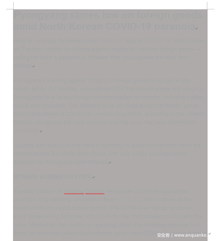 样本文件名:Pyongyang stores low on foreign goods amid North Korean COVID-19 paranoia.doc