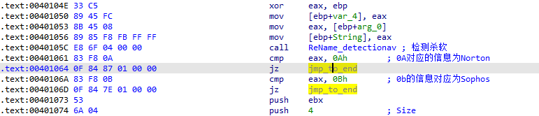 这里程序主要是检测是否存在0A和0B所对应的杀软,也就是Norton和Sophos,如果检测到这两款杀软程序就跳转到函数最后,不继续执行此函数功能。