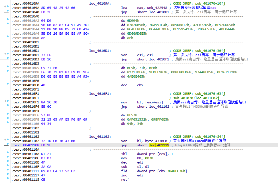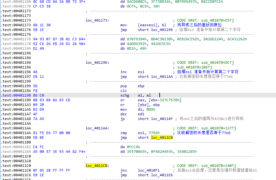 赋值给eax之后,程序首先会清空esi,然后通过自增esi和eax+esi的方式对这片内存中的每个字节进行操作,第一次执行时,程序会将eax+esi的值赋给bl并且将bl与4330c0处的值进行异或计算,计算的值存储到bl中。