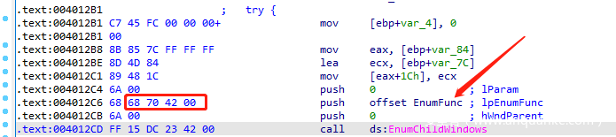 解密完成之后,EnumChildWindows的回调函数EnumFunc已经被替换为了解密后的代码