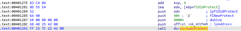 循环执行完毕,程序通过VirtualProtect更改0x422548到0x42A548的内存属性为0x40(可读可写可执行)