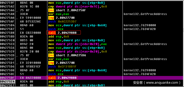 第二次异或之后,程序会将bl的值放回原位以替代原数据,同时自增esi,计算下一个字节的值。这里程序一共会将0x77E6大小的值以同样的方法进行计算解密出后面的shellcode。