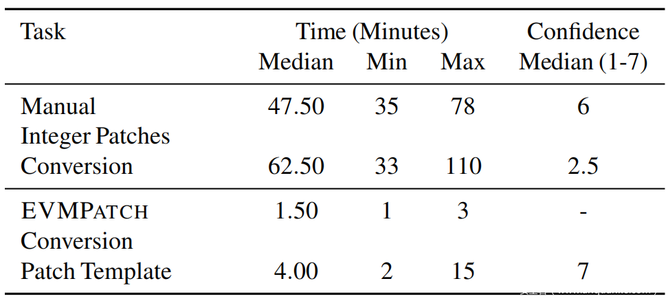 对于所有任务,本研究测量了开发人员执行任务所需的时间(不包括阅读任务说明所需要的时间)。要求开发人员对他们对相关技术的熟悉程度,对补丁的置信度以及在7点Likert量表上执行任务的难度进行评分。记录的时间度量如上表所示,在github存储库中提供了支持文件。然后,使用EVMPATCH进行了手动代码审查和交叉检查,以分析开发人员所犯的错误。研究结果表明,需要手动进行正确的智能合约修补,而EVMPATCH可以实现简单,用户友好和高效的修补。时间测量表明,没有EVMPATCH经验的开发人员能够在几分钟内利用EVMPATCH执行复杂的任务。