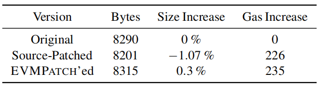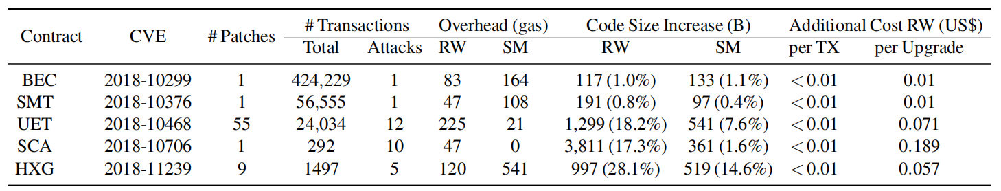 Gas费用:修补程序引入的其他代码可能会导致交易失败,并显示错误消息。尽管补丁通常不会显着增加gas消耗,但是当交易的发送方提供非常紧张的gas预算时,仍会发生这种行为。当由于修补程序异常而导致重新执行带有修补代码的事务而导致早期失败时,将无法准确地将修补合约与原始合约的行为进行比较。为了解决这个问题,在EVM中禁用了gas统计。在上表中报告了交易执行过程中的额外gas量。排除了那些不执行包含易受攻击代码的功能的交易,这些交易不受补丁影响,因此与本文度量无关。
