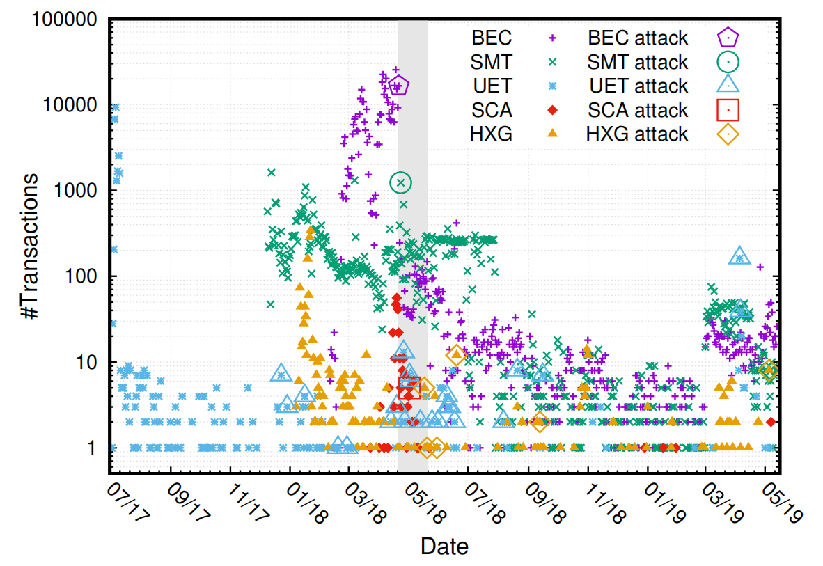 检测攻击:EVMPATCH的补丁程序测试器还能够识别任何先前的攻击交易。在上图中观察到,尽管在第一次攻击后的相当合理的时间内就报告了其他Token合约的漏洞,但在漏洞披露之前很久(5个月)就已经利用了UET。更令人惊讶的是,尽管公开披露漏洞后所有交易量都减少了,但所有合约仍然相当活跃。尽管在撰写本文之前的一年左右就已发现了所有这些漏洞,但在公开披露这些漏洞(包括成功的攻击)之后,仍然存在23,630笔交易(这些漏洞占被评估交易的4.66%)发布给这些脆弱的合约。这意味着这些合约的所有者没有正确迁移到补丁程序版本,也没有正确通知用户这些合约的易受攻击状态。