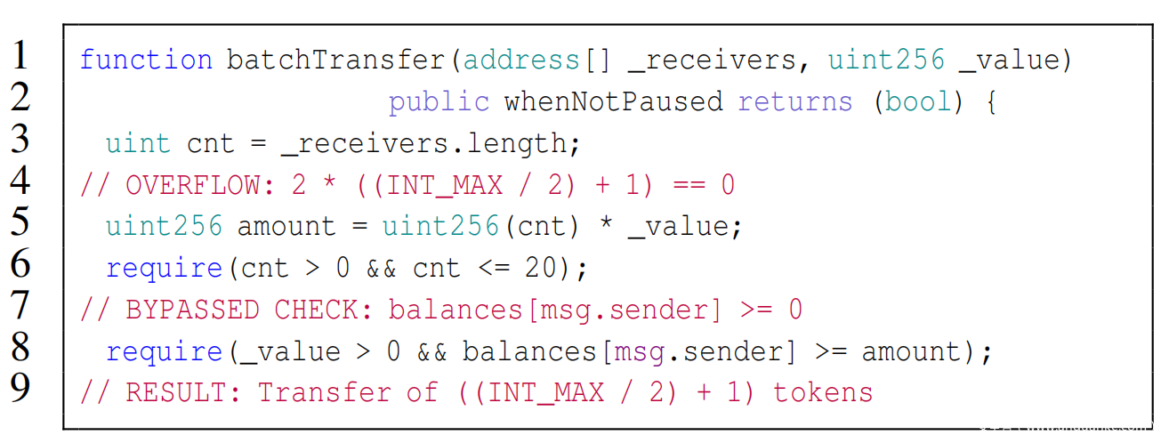 由于整数类型的固定位宽,典型的整数类型绑定到最小和/或最大大小。但是,程序员通常对实际整数类型的大小限制没有给予足够的重视,这可能会导致整数错误。幸运的是,几种高级编程语言(Python,Scheme)能够避免整数错误,因为它们利用了几乎无限大小的任意精度整数。但是,用于智能合约的事实上的标准编程语言(即Solidity)没有嵌入这种机制。这就给开发人员留下了完全处理整数溢出的负担,他们需要手动执行溢出检查或正确利用SafeMath库安全地执行数字运算。尽管很常见,但前者显然容易出错。例如,最近揭露了ERC-20代币合约中的多个漏洞。这些合约在以太坊区块链上管理所谓的Token。这样的Token可以处理大量货币,因为它们跟踪每个Token所有者的Token余额并介导Token和以太币的交换。