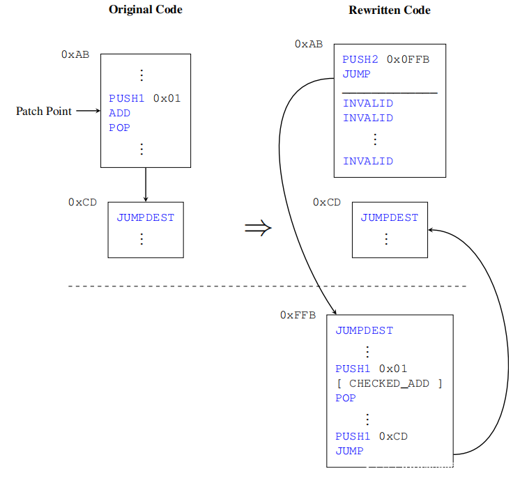 上图显示了重写器如何更改原始合约的控制流图的示例。用已检查的添加例程代替ADD指令,该例程还执行整数溢出检查。将ADD指令的地址称为补丁点。包含跳接点的基本块被 trampoline替换。在这种情况下,它立即跳到0xFFB的基本块。该基本块位于原始合约的末尾,是原始基本块在0xAB处的副本,但已应用了补丁。由于基本块现在位于合约的末尾,因此字节码重写器可以在基本块中插入,更改和删除指令,而无需更改位于高编号地址的代码中的任何地址。使用INVALID指令填充原始基本块的其余部分,以确保基本块的大小与原始基本块的大小完全相同。 0xCD处的基本块通过下降沿连接到先前的基本块。但是,此基本块以JUMPDEST指令开头,因此是合法的跳转目标。因此,重写器随后将跳转添加到已修补的基本块的0xFFB处,以确保执行以原始合约的代码在地址0xCD处继续执行。