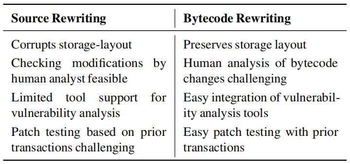 如上表所示,有两种在以太坊中自动生成补丁的可能策略:源代码或EVM字节码的静态重写。乍看之下,源代码修补似乎是一种选择,因为开发人员可以访问源代码,他们可以检查源代码更改,甚至可以在自动方法引入不希望的更改的情况下进行调整。但是,在以太坊中,应用源代码重写存在一个主要挑战:一个需要仔细保留存储布局。否则,修补后的合约将破坏其内存并失败,或者(更糟)引入危险的错误。即,即使更改不会破坏合约的逻辑,源代码中的某些更改也可能破坏合约的兼容性。