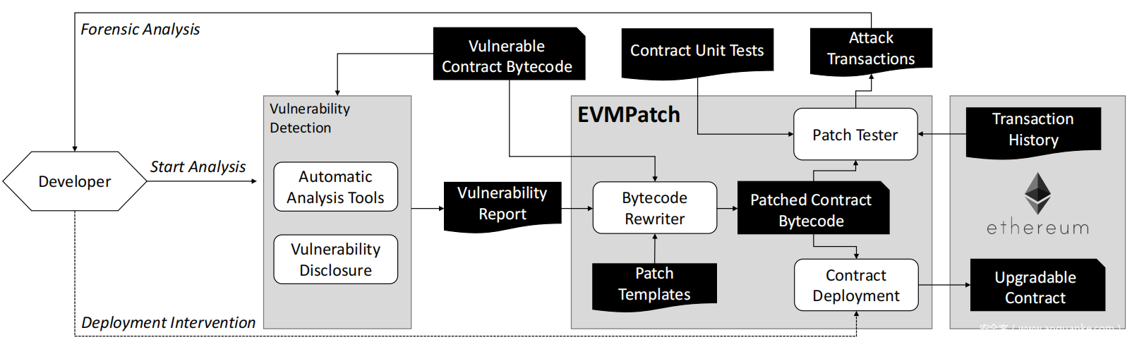 在本节中将介绍自动修补工具框架的设计,以及时修补和强化智能合约。本文提出的框架在未修改的智能合约上运行,并且与源代码编程语言无关,因为它不需要源代码。在其核心部分,框架利用字节码重写器将最小程度的侵入式补丁应用于EVM智能合约。结合基于代理的可升级智能合约,这种字节码重写方法使开发人员可以自动引入补丁并将其部署在区块链上。这种方法的一个主要优点是,当发现新的攻击类型或改进了漏洞查找工具时,可以在短时间内以最少的开发人员干预自动重新检查,修补和重新部署合约。 EVMPATCH通常在开发人员的计算机上执行,并持续运行新的和更新的漏洞检测工具。这也可以包括动态分析工具,该工具可以分析尚未包含在区块中但已经可供以太坊网络使用的交易。每当分析工具之一发现新漏洞时,EVMPATCH都会自动修补合约,测试修补后的合约并进行部署。