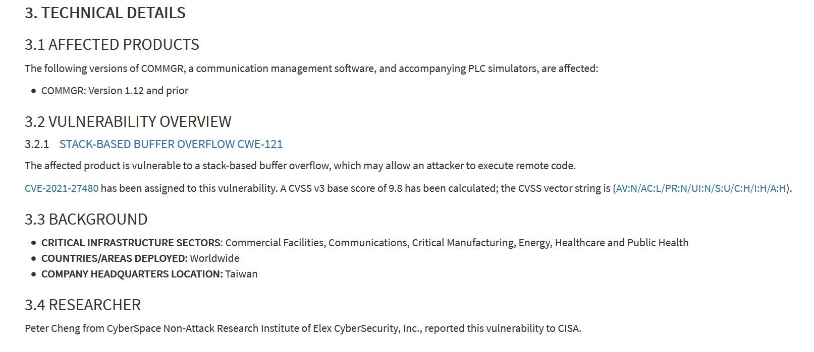 日前,美国ICS-CERT官网发布了由博智安全科技股份有限公司(以下简称“博智安全”)旗下博智赛博空间非攻研究院报送的一个远程任意代码执行漏洞,漏洞编号:CVE-2021-27480,CVSS v3评分9.8。2020年10月,非攻研究院在安全研究过程中,发现了Delta Industrial Automation公司COMMGR软件存在远程代码执行漏洞,遂向工业控制系统网络应急响应小组(The Industrial Control Systems Cyber Emergency Response Team ,简称ICS-CERT)上报了该漏洞,经ICS-CERT与厂家多次沟通确认,最终厂商确认并修复了漏洞,发布了软件更新版本:https://us-cert.cisa.gov/ics/advisories/icsa-21-110-03。