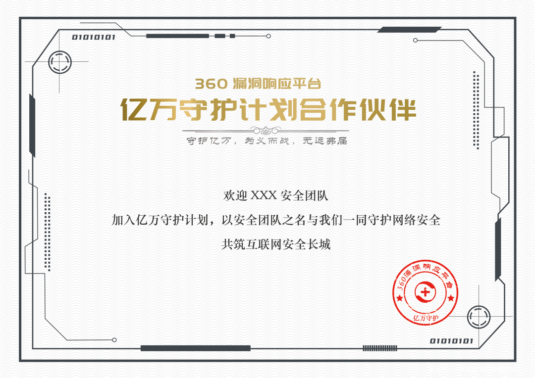 没有网络安全就没有国家安全。在刚刚发布的“中华人民共和国国民经济和社会发展第十四个五年规划和 2035 年远景目标纲要”中,“网络安全”一词出现了14次,“安全”一词出现了180余次。网络安全不仅关乎国家、社会、基础设施等安全,也和我们的衣食住行密切相关,是事关经济社会发展、国家长治久安和人民众福祉的重大战略问题。360漏洞响应平台(SRC)积极响应国家及监管单位号召,特推出“亿万守护计划”。该计划旨在守护互联网空间安全,以“守护互联网亿万驻民和企业网络空间安全”为使命,倡导全网优秀白帽子用安全技术赋能互联网安全事业发展,抵御网络攻击威胁,提升网络防御能力,降低安全漏洞被恶意利用的风险,筑牢网络安全坚实防线。