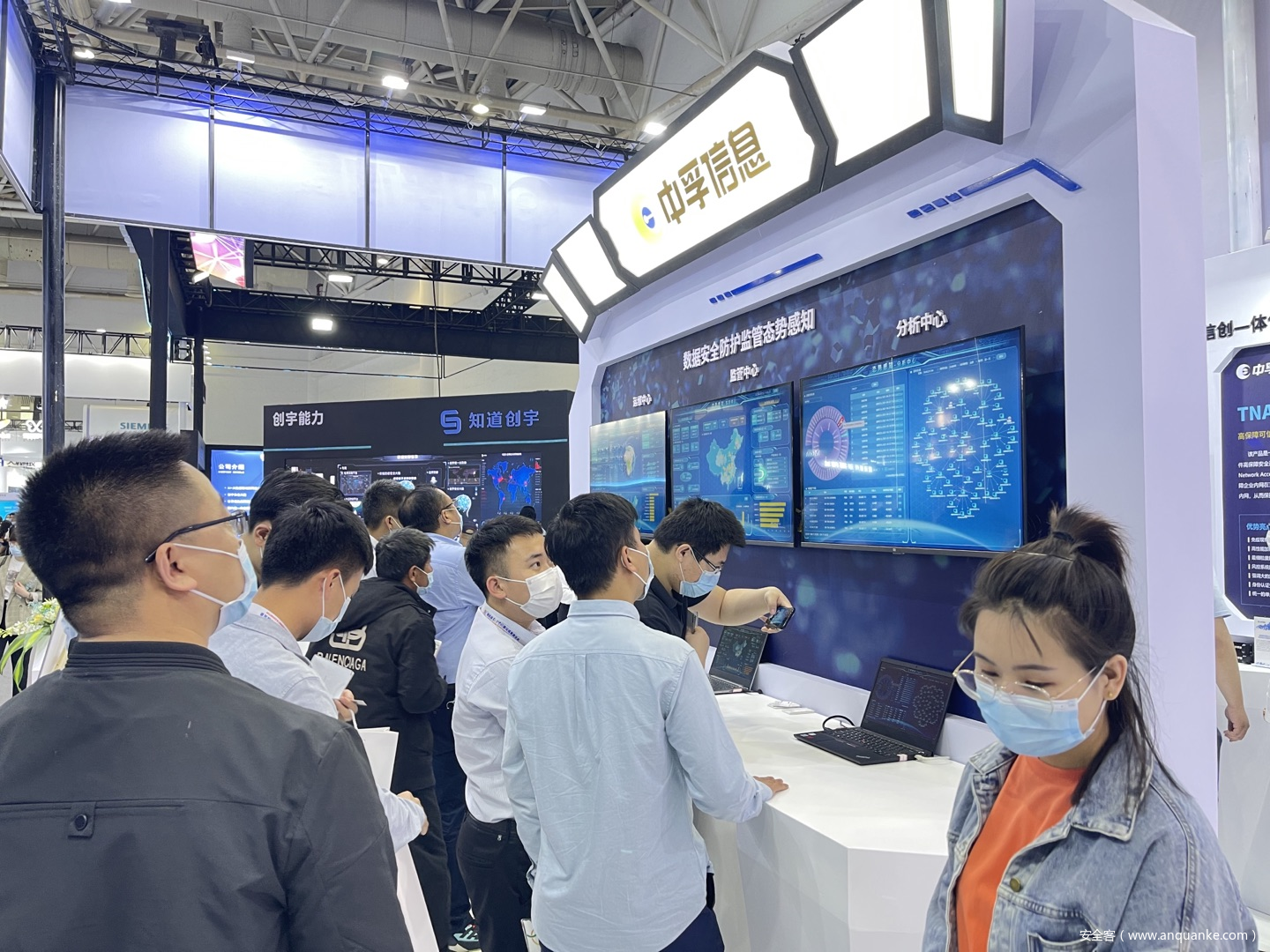 值得关注的是,中孚信息推出的数字安全防护监管态势感知体系成为展区里的重磅“大咖”,炫酷的“黑科技”引来众多参展者的围观及拍摄。