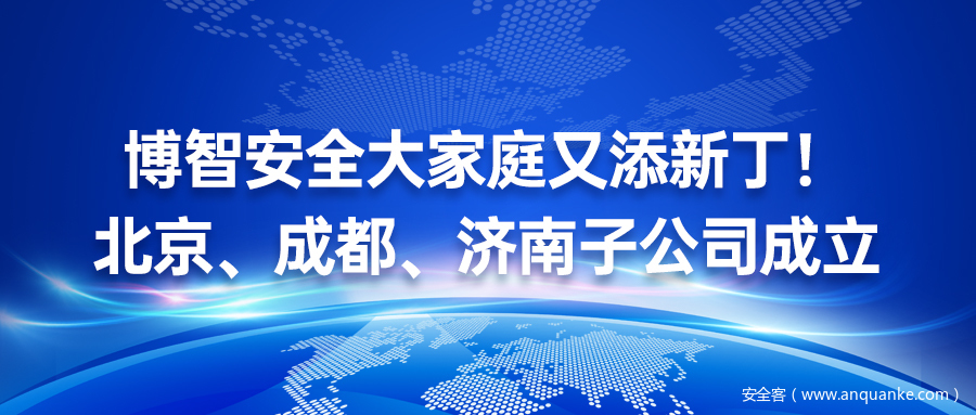 为进一步促进区域行业市场拓展和业务销售,近日,博智安全科技股份有限公司(以下简称“博智安全”)成立子公司博智信安(北京)科技有限公司(全资)、博智信安(济南)科技有限公司(全资)、博智信安(成都)科技有限公司(全资)。三家全资子公司均完成注册登记,并取得市场监督管理局颁发的《营业执照》。