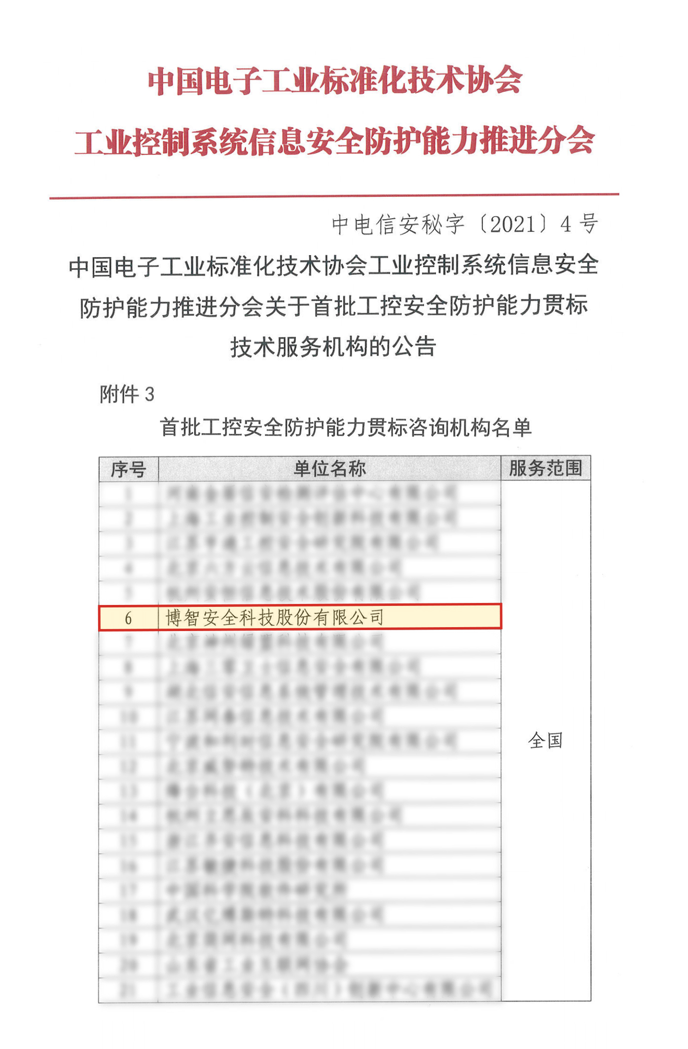 近日,中国电子工业标准化技术协会工业控制系统信息安全防护能力推进分会(以下简称“分会”)依据《关于遴选首批工控安全防护能力贯标技术服务机构的通知》(中电信安〔2021〕3号)《中国电子工业标准化技术协会工业控制系统信息安全防护能力推进分会工作守则》和《工业控制系统信息安全防护贯标工作管理办法(暂行)》有关规定,发布首批工控安全防护能力贯标技术服务机构名单。博智安全科技股份有限公司(以下简称“博智安全”)凭借领先的工控安全技术优势和丰富的实践经验,成功入选首批工控安全防护能力贯标咨询机构。