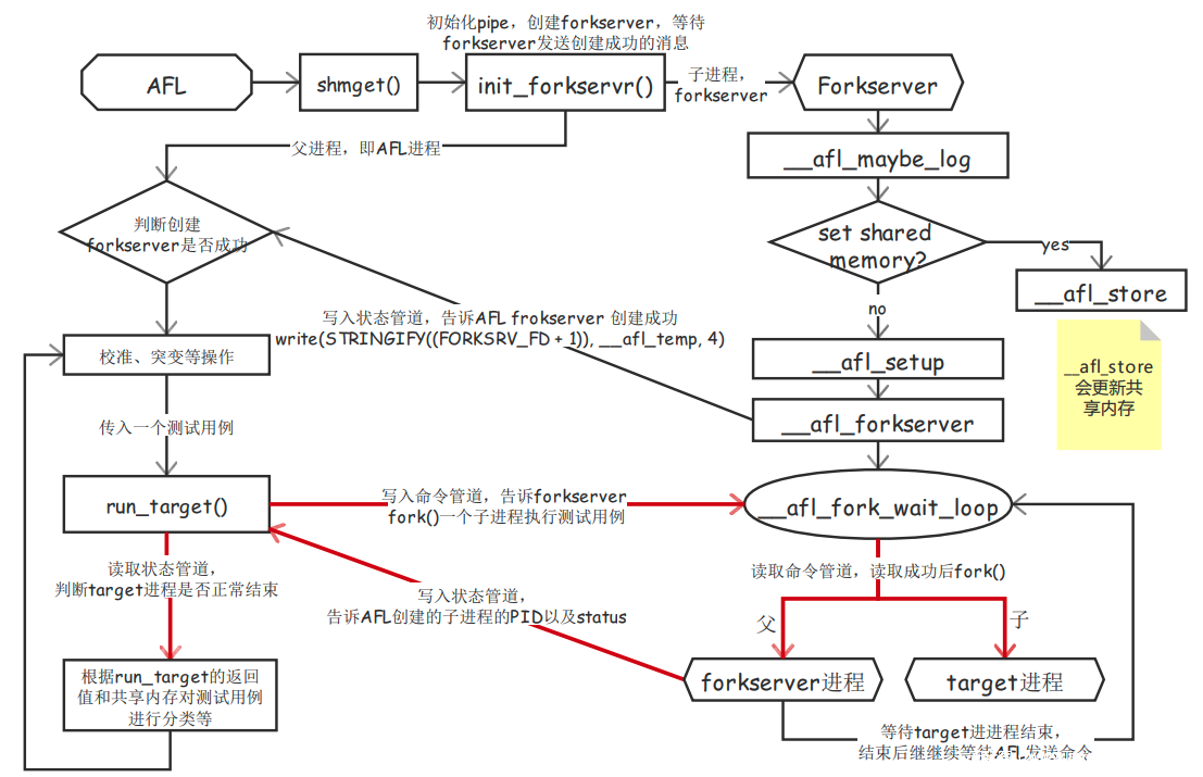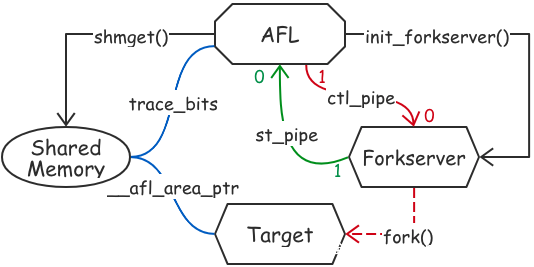 AFL一共涉及三个进程,AFL进程,forkserver进程,以及targetg进程。AFL进程创建了forkserver进程,forkserver进程根据AFL的指令创建target进程。