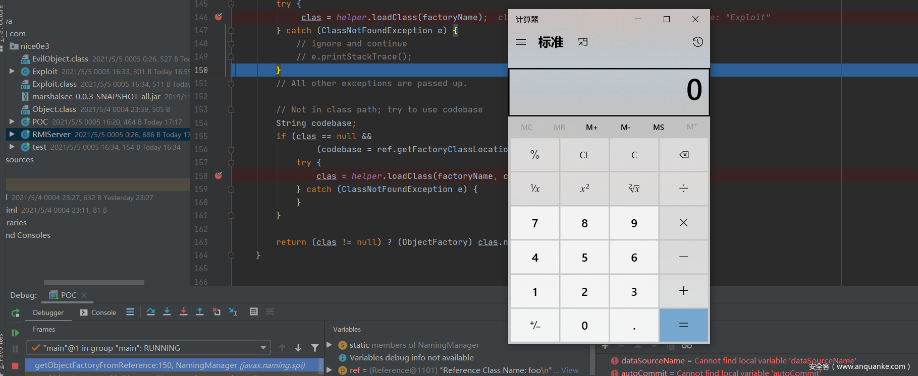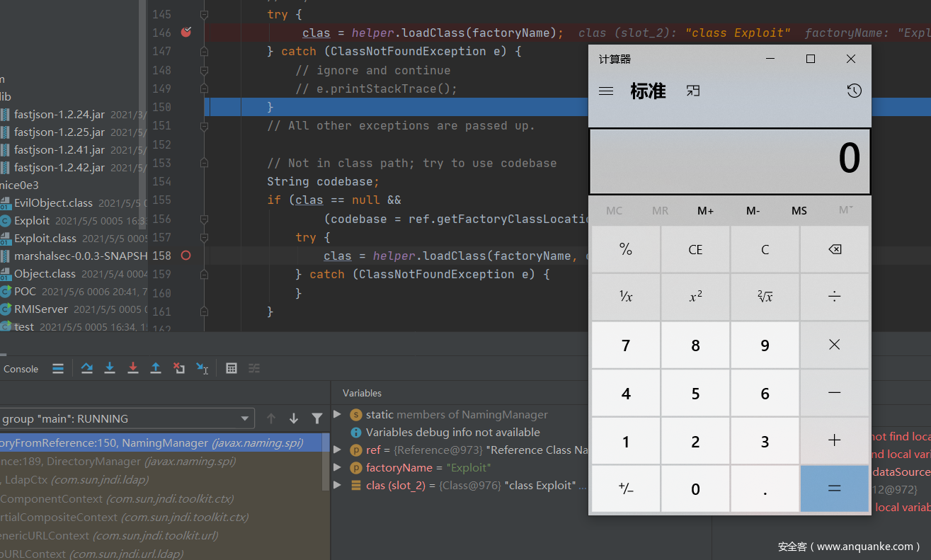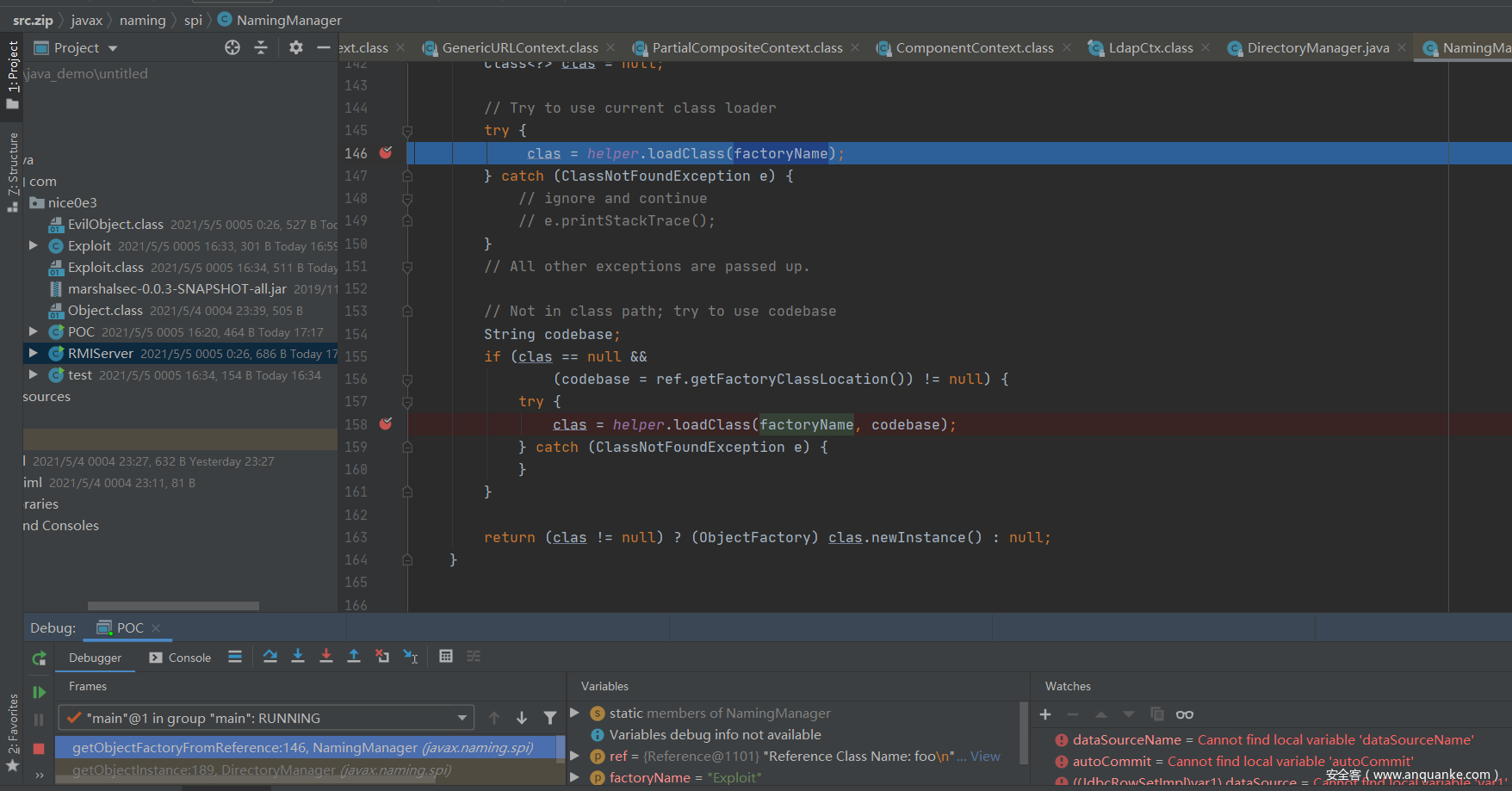 lookup()操作时,会动态加载并实例化Factory类,接着调用factory.getObjectInstance()获取外部远程对象实例; - 攻击者可以在Factory类文件的静态代码块处写入恶意代码,达到RCE的效果;