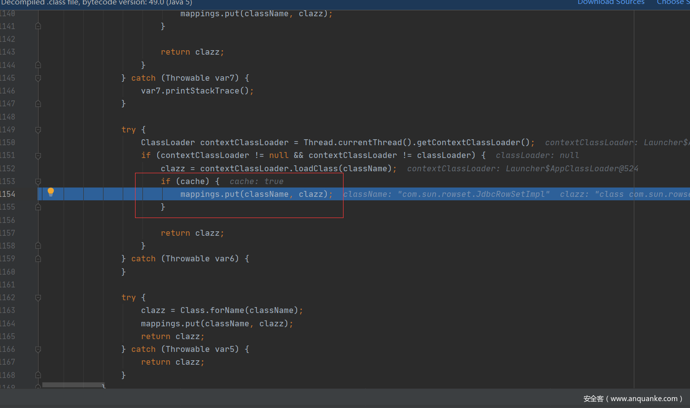 因为前面将com.sun.rowset.JdbcRowSetImpl所以这里能获取到com.sun.rowset.JdbcRowSetImpl该判断不为true,从而绕过黑名单。