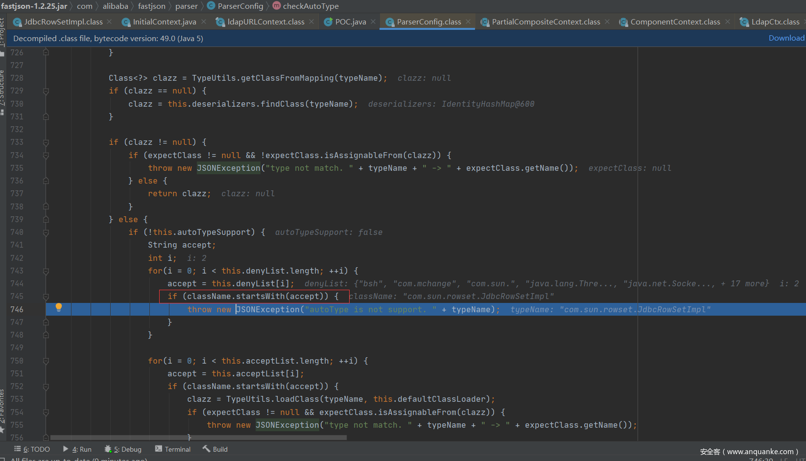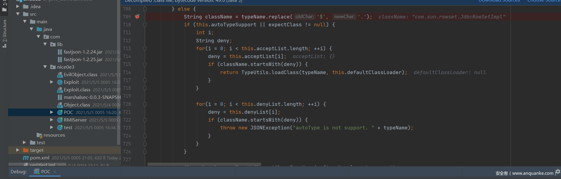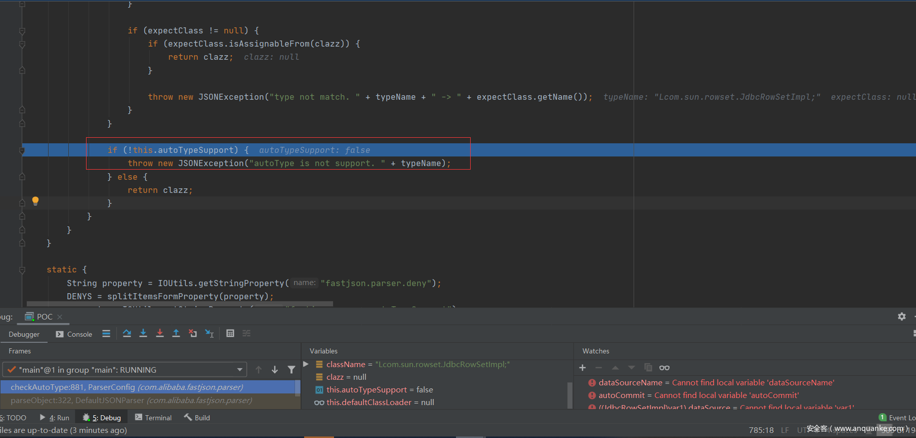 断点来到com.alibaba.fastjson.parser.DefaultJSONParser#checkAutoType
