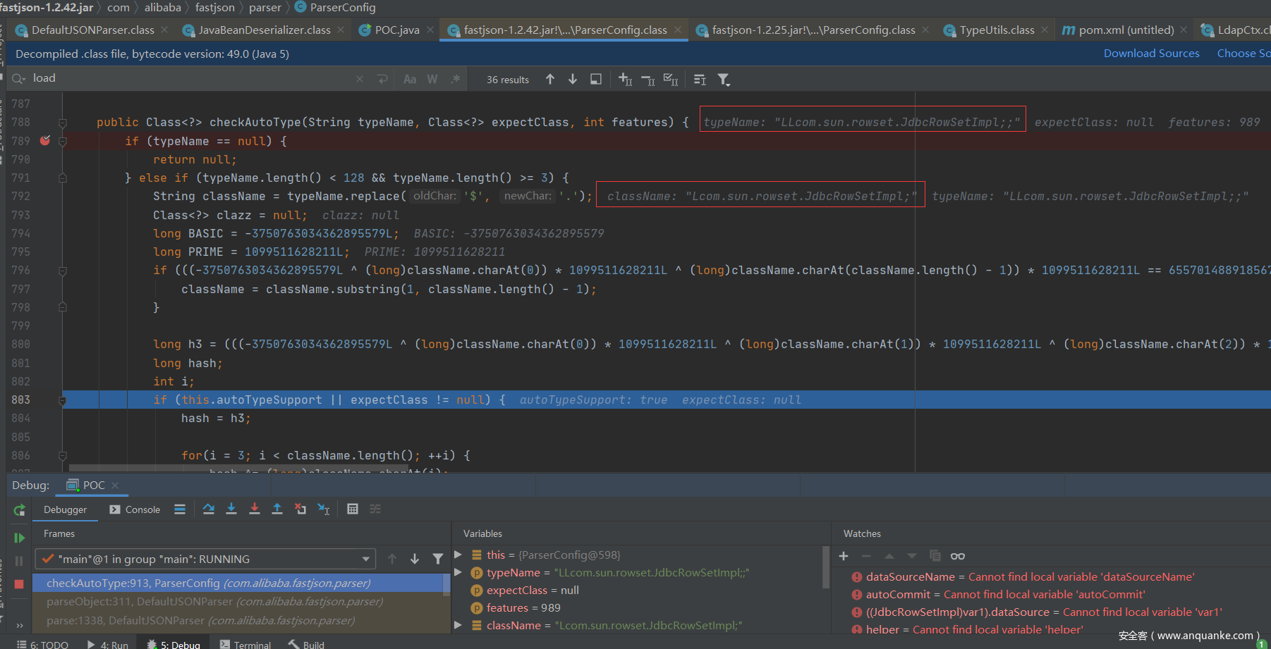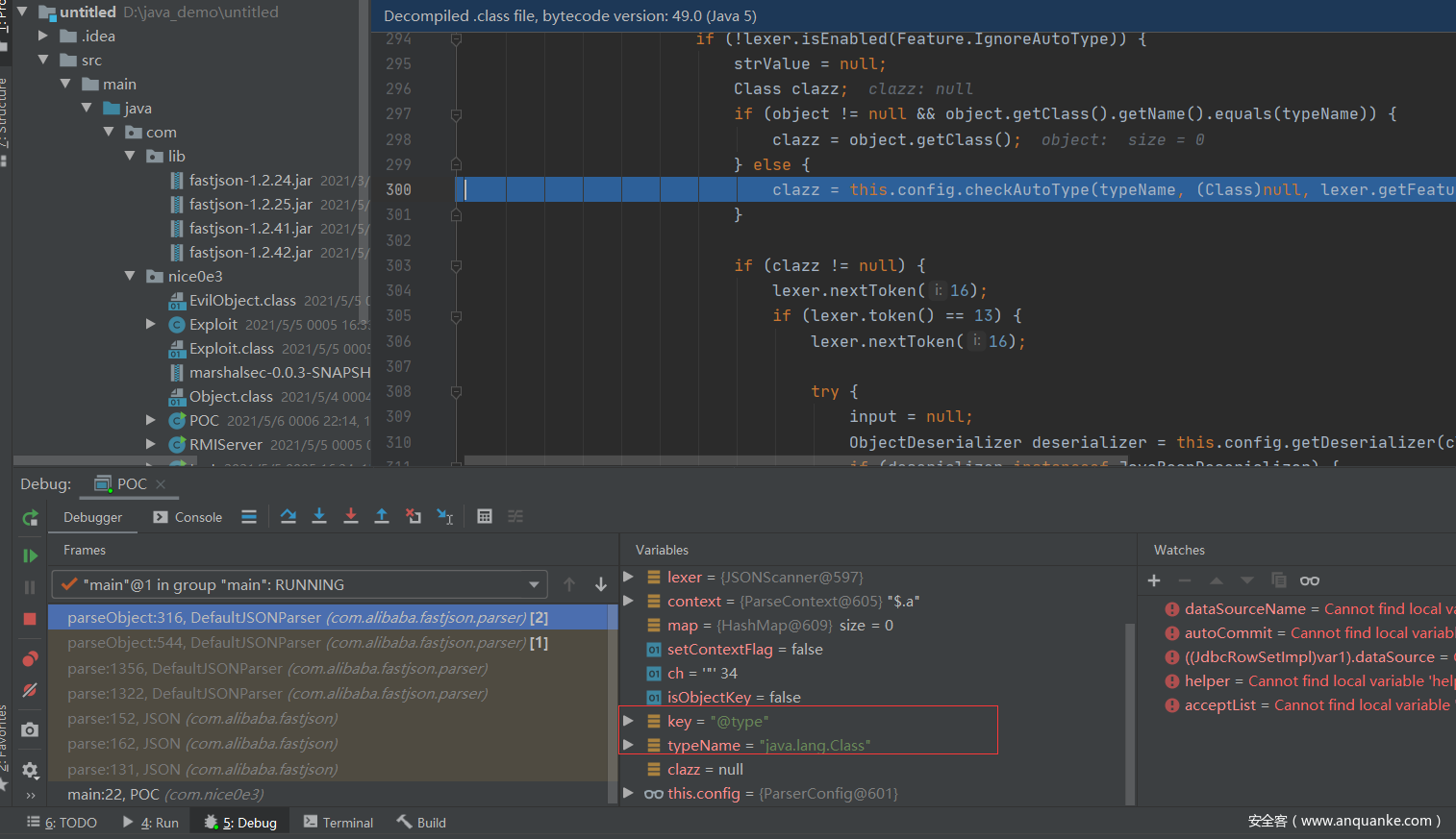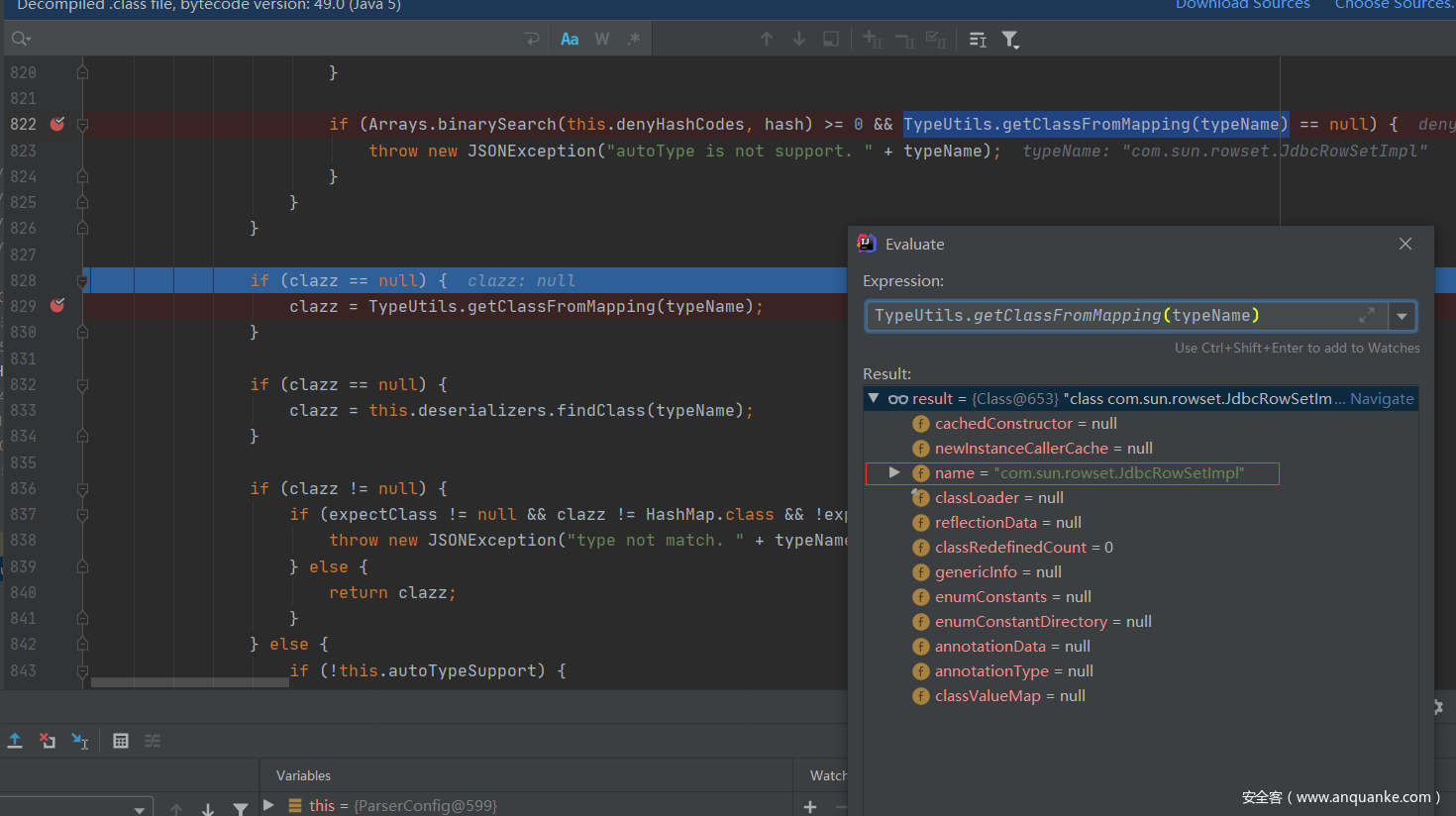 断点来到com.alibaba.fastjson.parser.DefaultJSONParser#checkAutoType