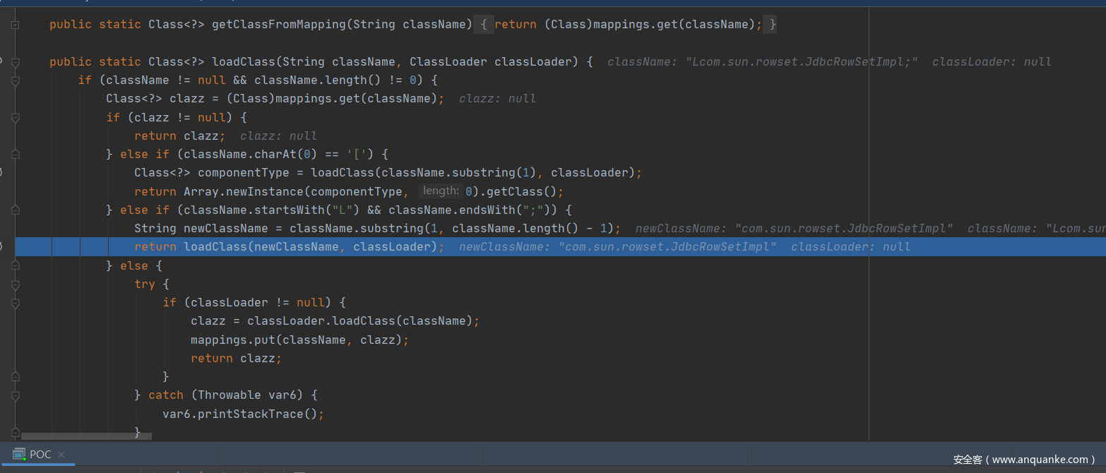 这里使用了TypeUtils.loadClass函数加载了strVal,也就是JdbcRowSetlmpl,跟进发现会将其缓存在map中。