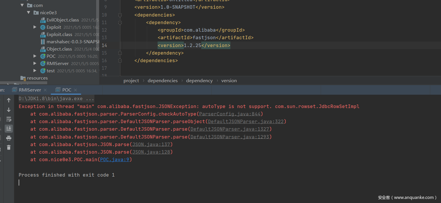 Exception in thread "main" com.alibaba.fastjson.JSONException: autoType is not support. LLcom.sun.rowset.JdbcRowSetImpl;; at com.alibaba.fastjson.parser.ParserConfig.checkAutoType(ParserConfig.java:914) at com.alibaba.fastjson.parser.DefaultJSONParser.parseObject(DefaultJSONParser.java:311) at com.alibaba.fastjson.parser.DefaultJSONParser.parse(DefaultJSONParser.java:1338) at com.alibaba.fastjson.parser.DefaultJSONParser.parse(DefaultJSONParser.java:1304) at com.alibaba.fastjson.JSON.parse(JSON.java:152) at com.alibaba.fastjson.JSON.parse(JSON.java:162) at com.alibaba.fastjson.JSON.parse(JSON.java:131) at com.nice0e3.POC.main(POC.java:12)