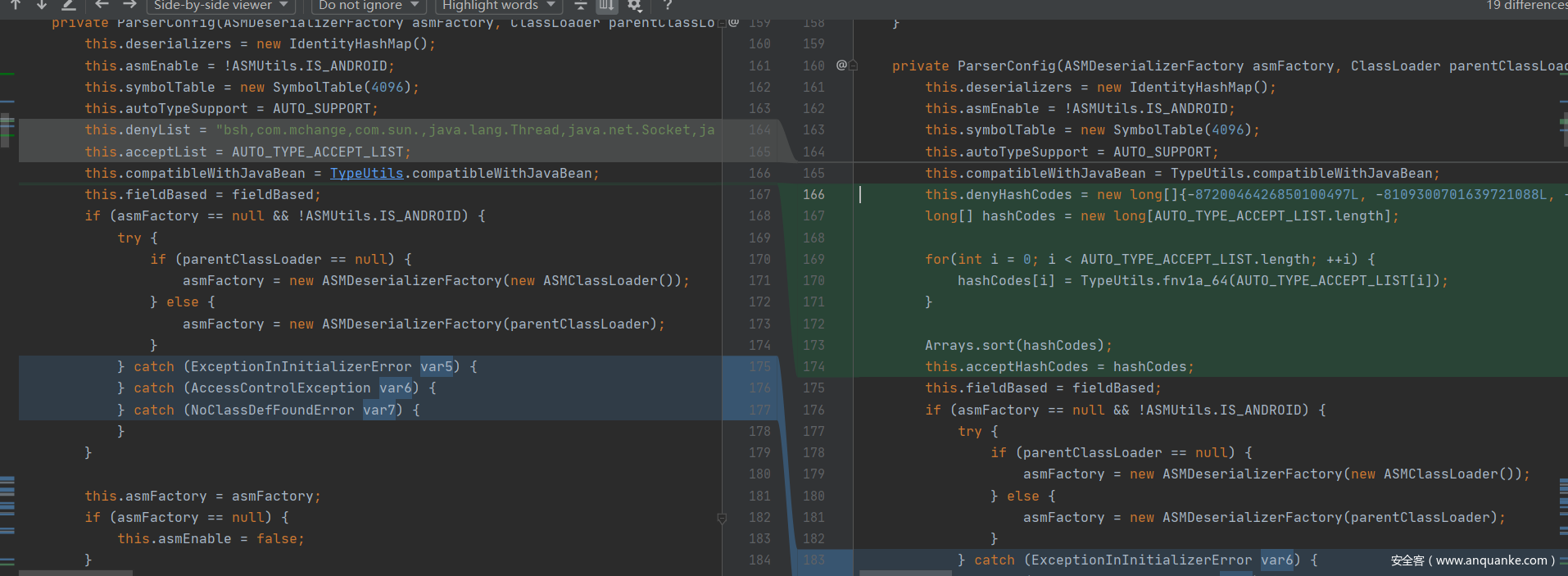 修复改动:明文黑名单改为HASH值,checkcheckAutoType方法添加L和;字符过滤。