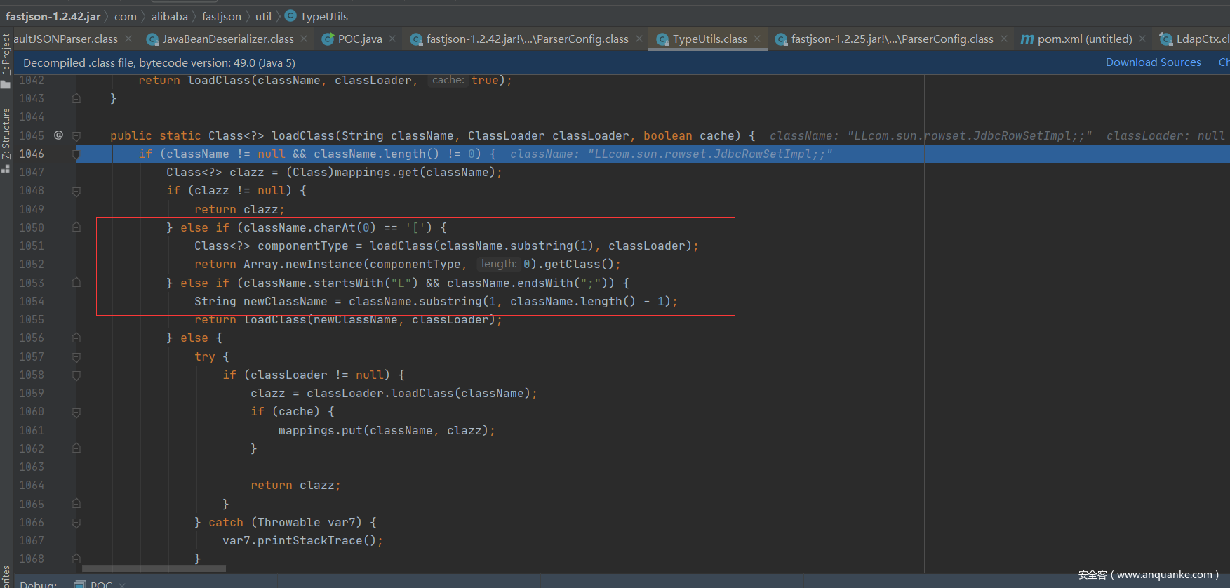 在com.alibaba.fastjson.parser#checkcheckAutoType中将L和;进行清空。这里是利用了双写的方式,前面的规则将第一组L和;,进行清空,而在TypeUtils.loadclass中将第二组内容清空。