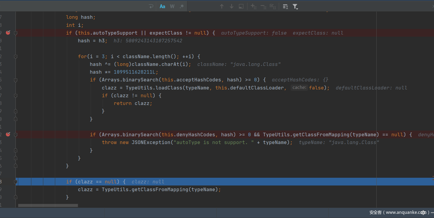 //hash计算基础参数 long BASIC = -3750763034362895579L; long PRIME = 1099511628211L; //L开头,;结尾 if (((-3750763034362895579L ^ (long)className.charAt(0)) * 1099511628211L ^ (long)className.charAt(className.length() - 1)) * 1099511628211L == 655701488918567152L) { //LL开头 if (((-3750763034362895579L ^ (long)className.charAt(0)) * 1099511628211L ^ (long)className.charAt(1)) * 1099511628211L == 655656408941810501L) { throw new JSONException("autoType is not support. " + typeName); } className = className.substring(1, className.length() - 1); }