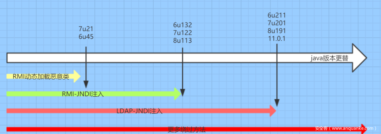 首先来说说限制,基于JNDI+RMI或JDNI+LADP进行攻击,会有一定的JDK版本限制。