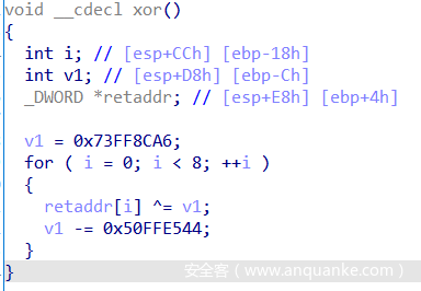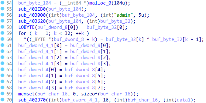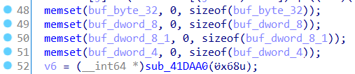 继续分析,可以看出调用的三个函数sub_402EB0、sub_403000和sub_403620都对处理过的data1数据无关,则猜测产生的buf_dword_8数据应该是固定的。在进行异或处理后对两个buf_dword_4数据进行赋值。