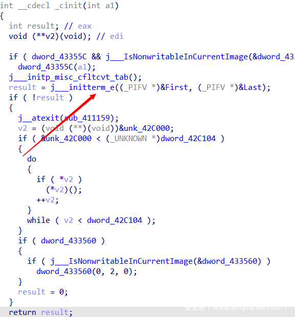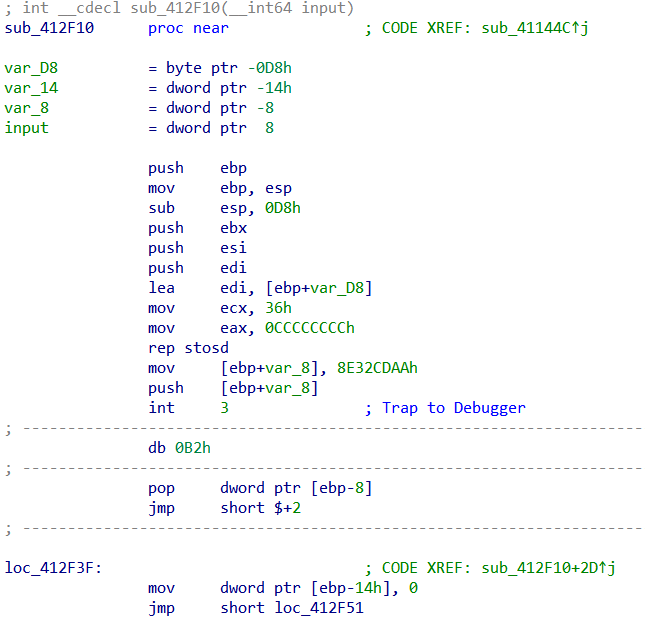 因此猜测可能在main函数中设置的int 3触发之前,还会由其他原因触发该调试事件两次,因此使用变量byte_432354来加以控制。