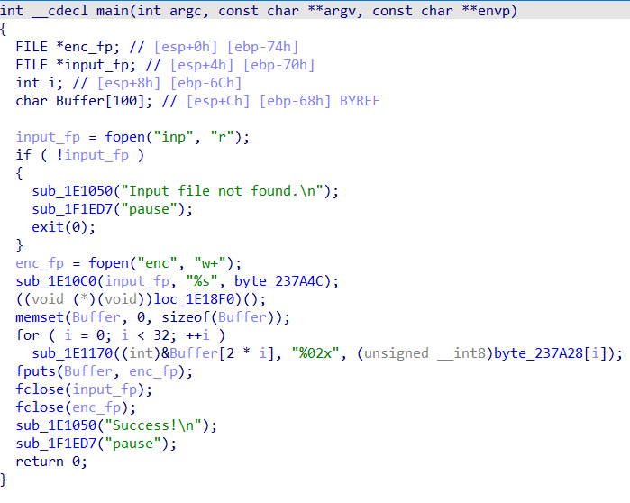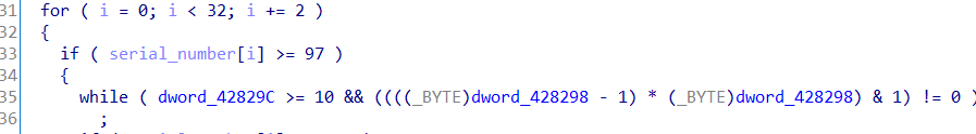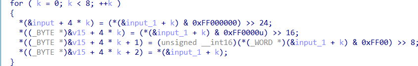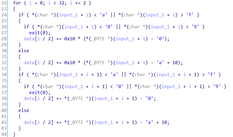 首先,根据循环条件猜测input长度应该就是32(少了直接在循环中退出,多了也用不上),限定了输入只能为十六进制的16个字符,并每两个字符为一组转换为数据。